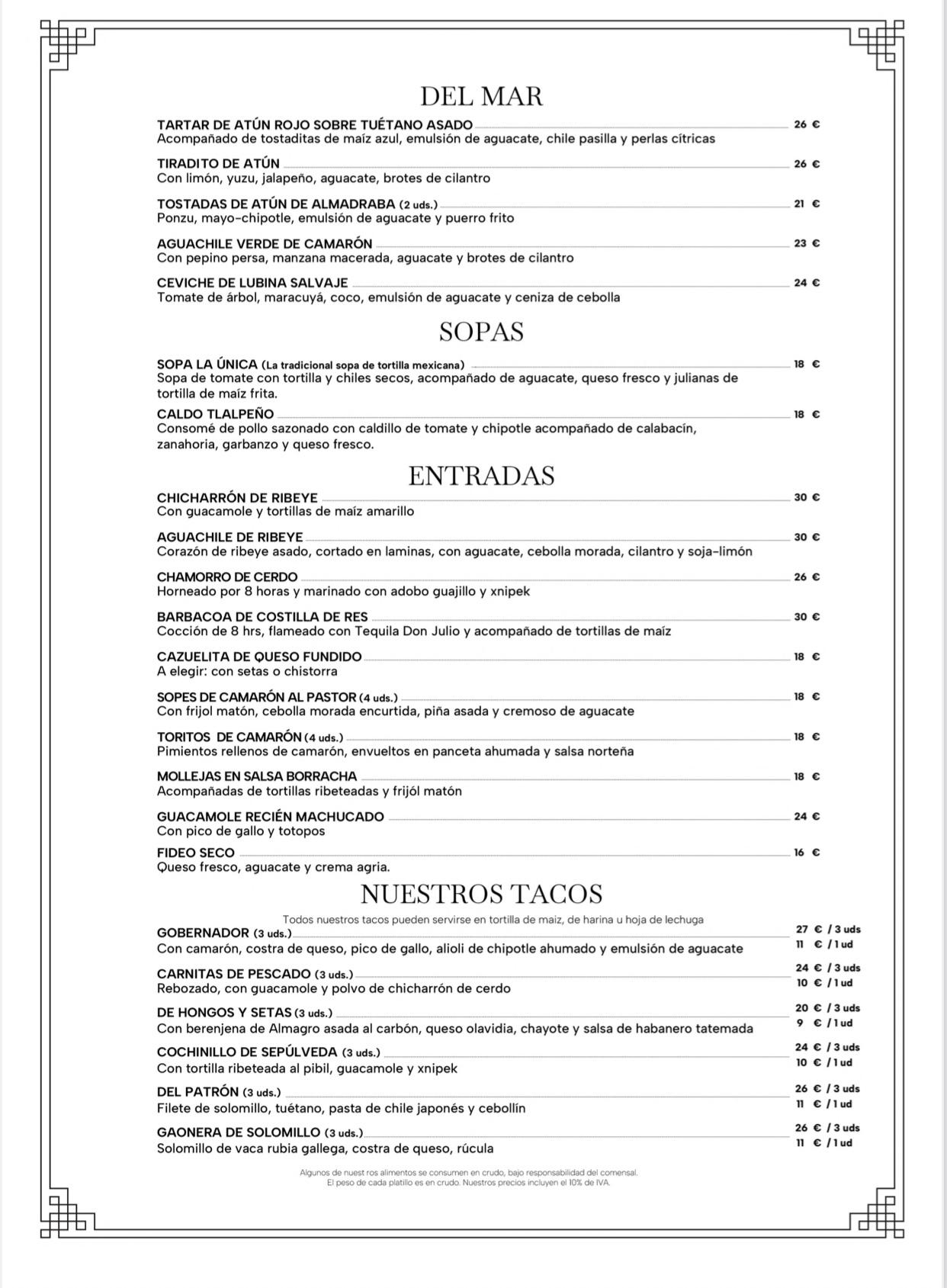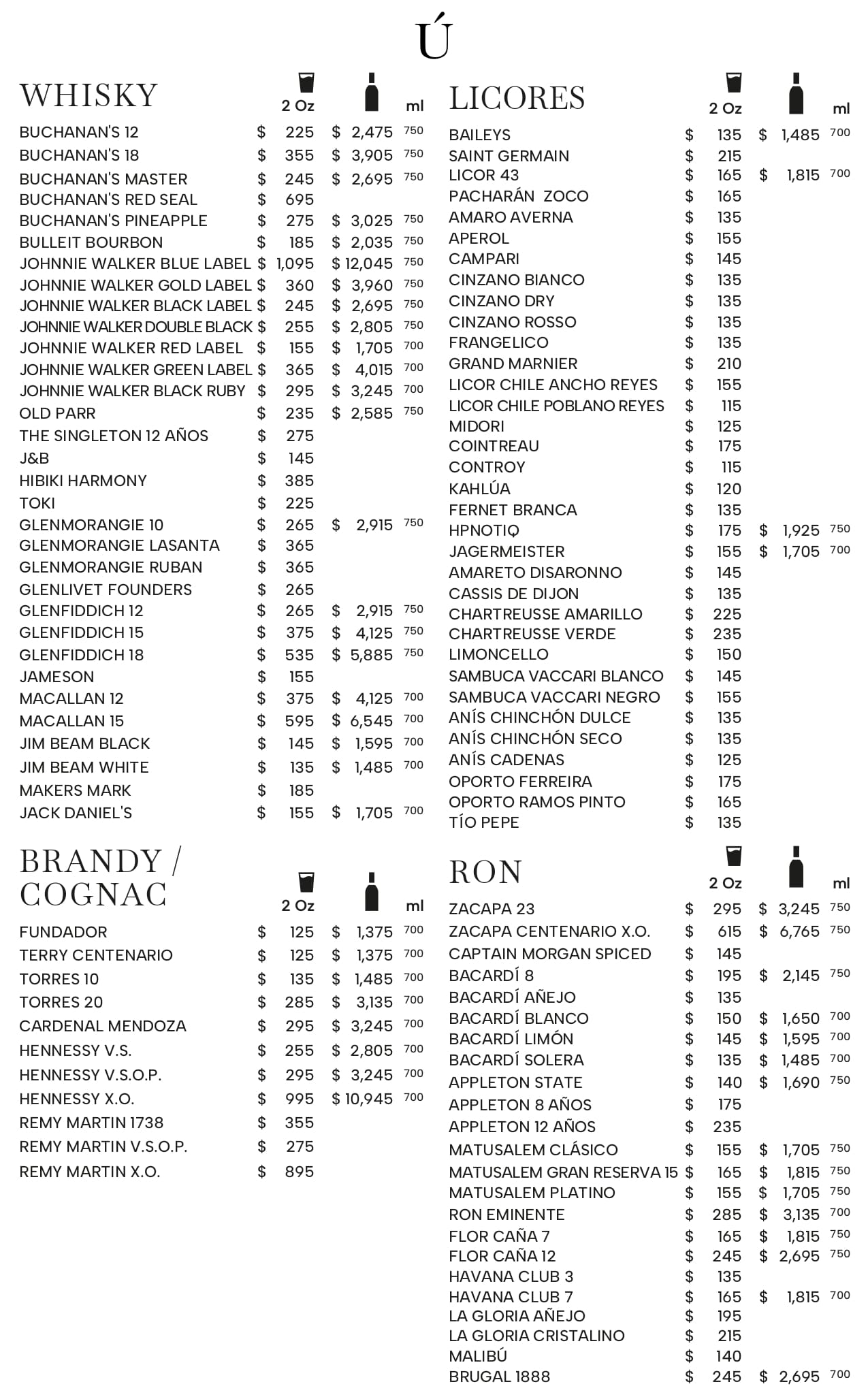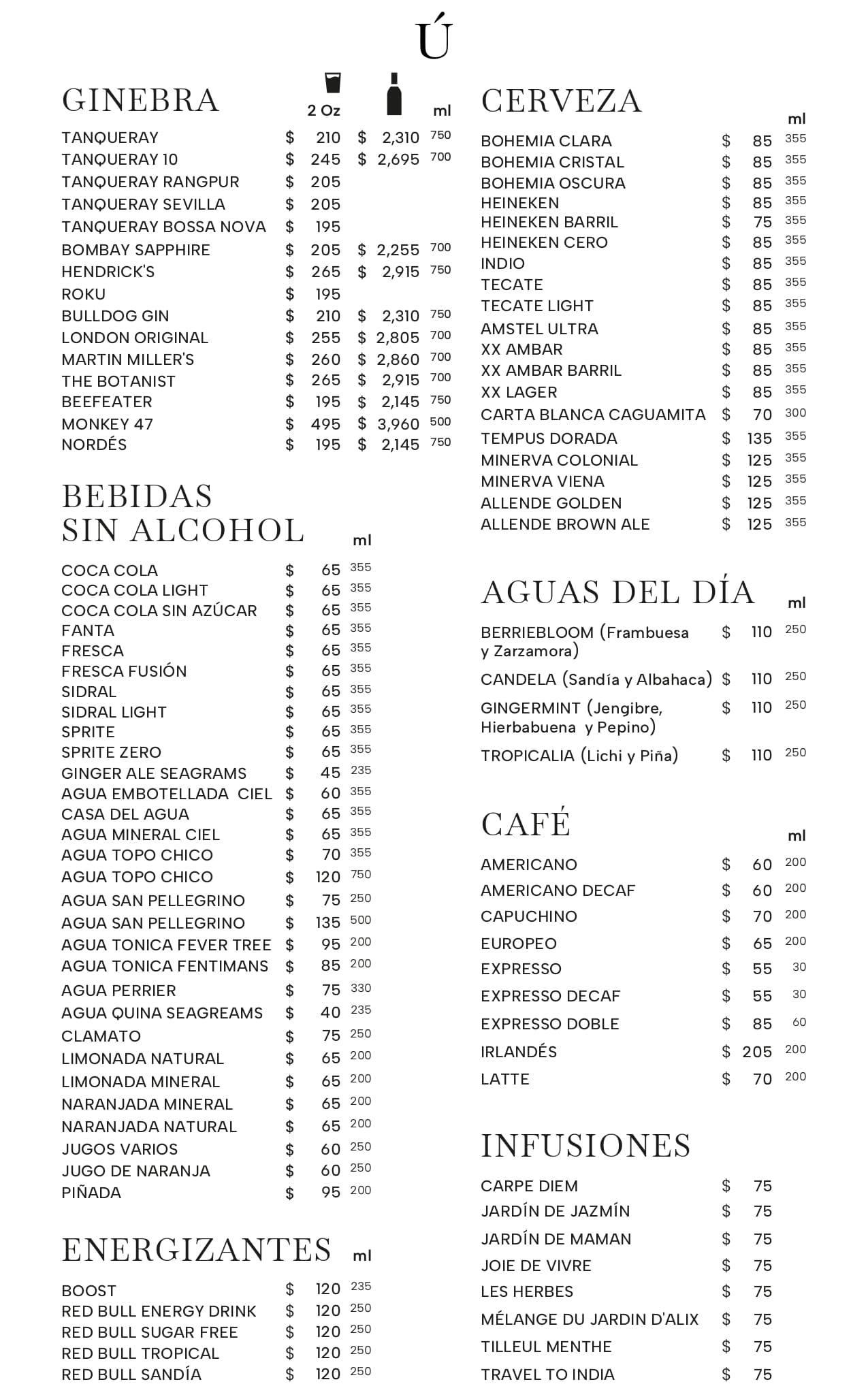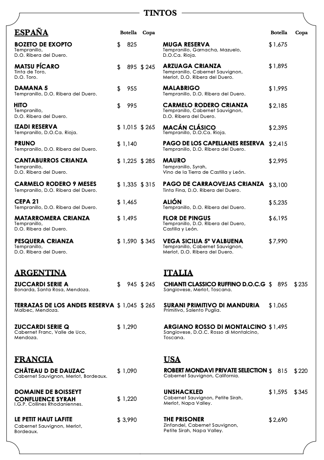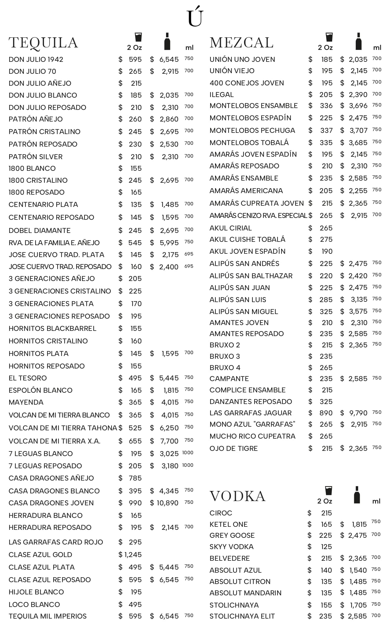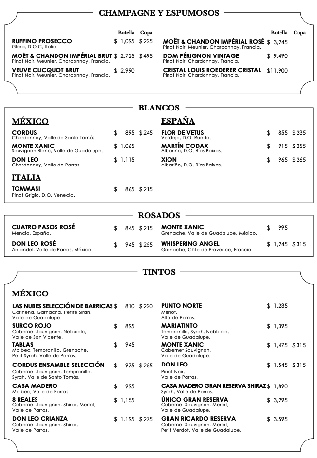 El consumo de alcohol es responsabilidad de quién lo consume. Nuestras botellas son de 750 ml. y las copas son de 150 ml. Los mezcladores premium se cobrarán al precio de la carta. Los precios en moneda nacional incluyen un 16 % de IVA.